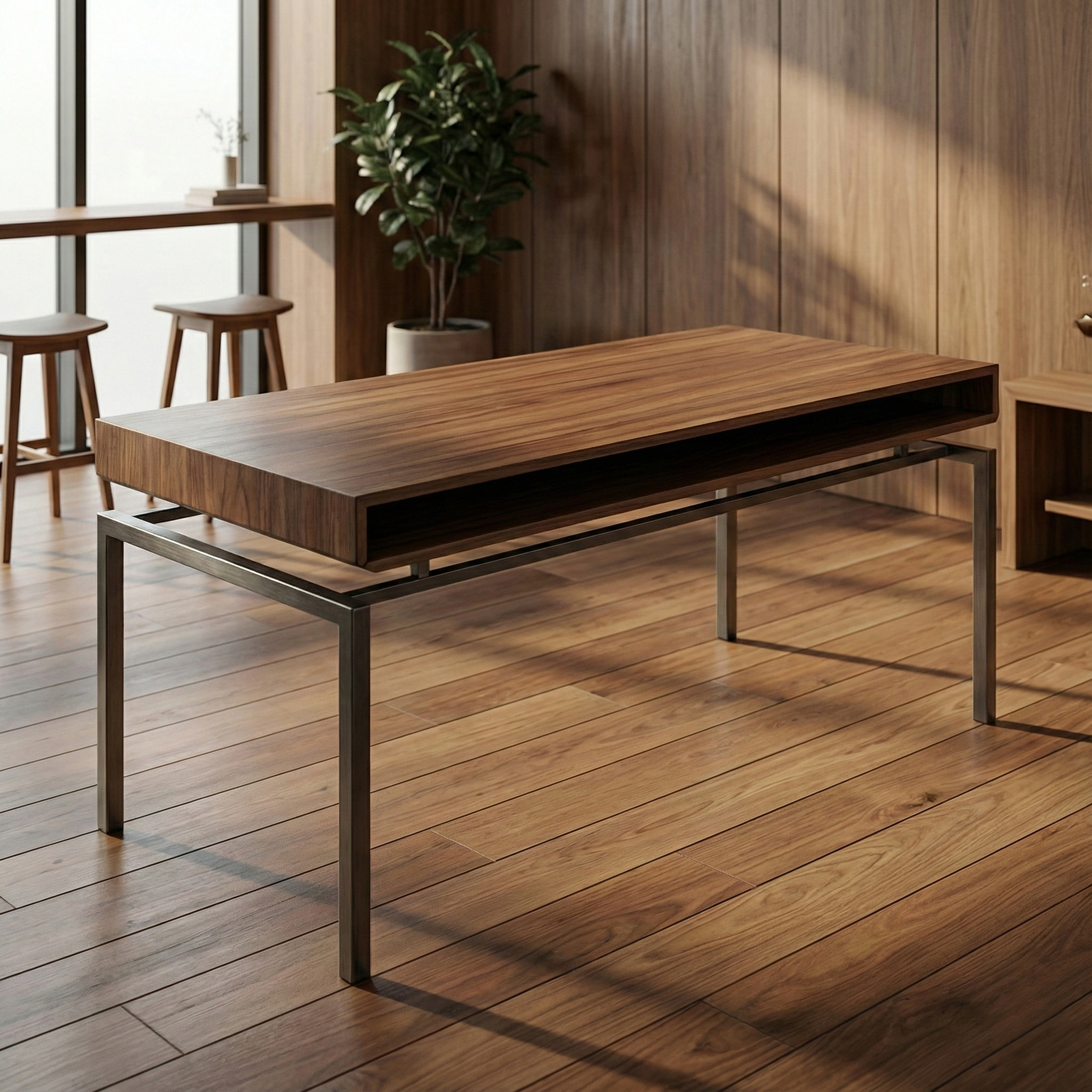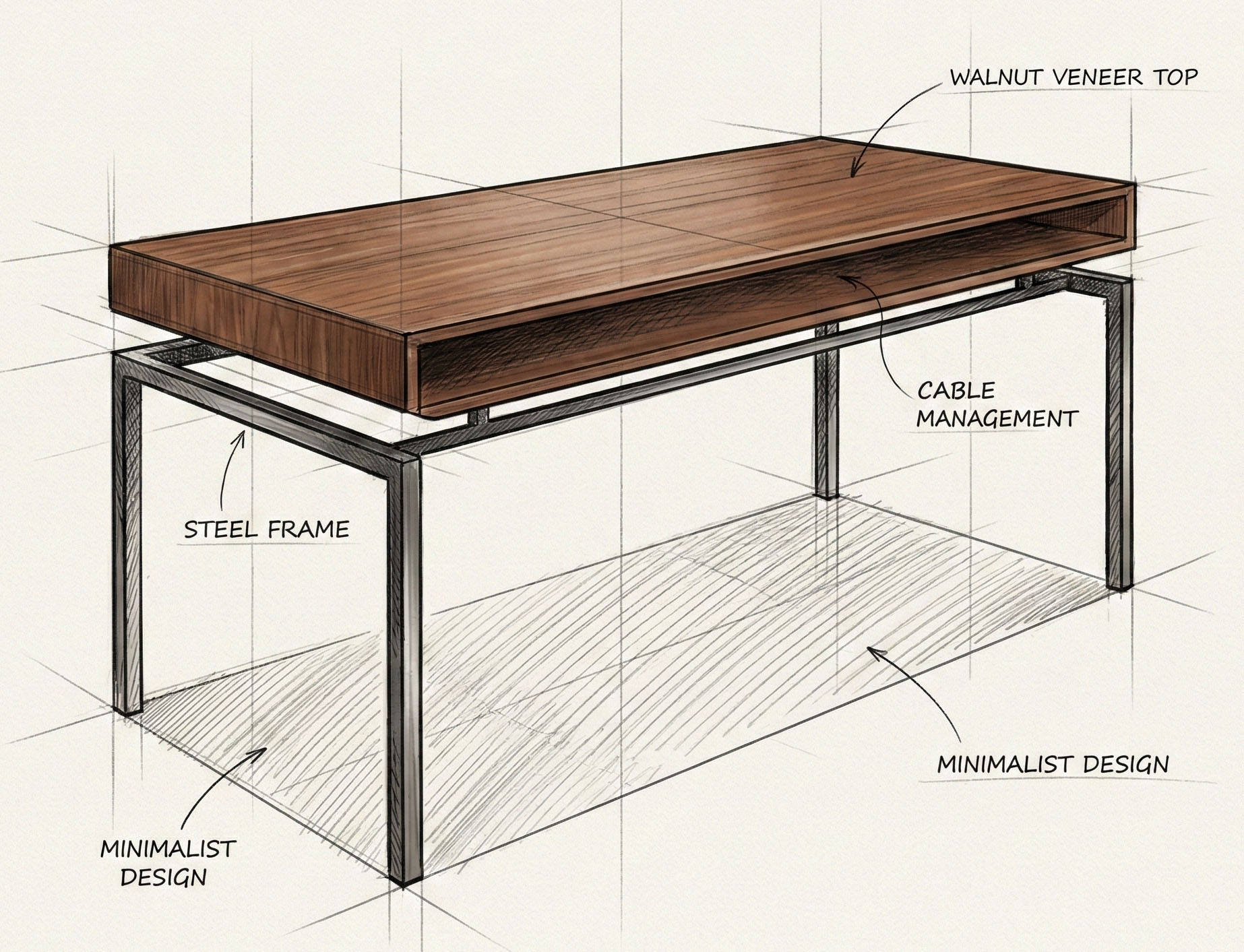 A premium minimalist desk featuring a walnut veneer top paired with a matte black steel frame.
